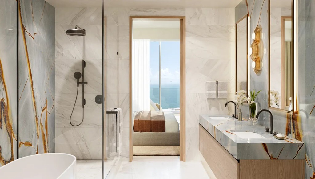 Breathtaking water views from every home Expansive balconies with floor-to-ceiling sliding glass doors Open, light-filled bedrooms Oversized walk-in closets in all primary bedrooms Gourmet kitchens designed and curated by Meyer Davis-with custom Italian cabinetry, imported porcelain countertops, and sleek kitchen islands-in a choice of two color schemes Fully integrated Bosch and Thermador appliance package, including paneled refrigerator and freezer, induction cooktop, oven, speed oven, and dishwasher Spa-inspired primary baths outfitted with elegant soaking tubs and fixtures by Kohler and Hansgrohe